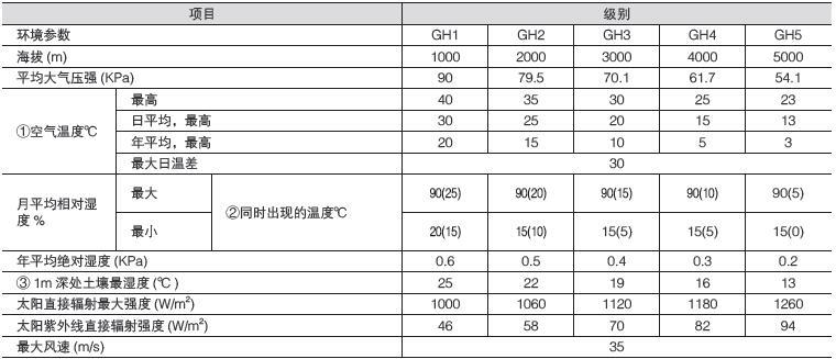 注:①最低温度可取-10、-25、-10 及+5℃四种之一种; ②月平均最大相对湿度及同时出现的温度中的参数值,分别表示海拔0~1 000,1000~2000,2000~3000,3000~4000,4000~5000m 处的参数值; ③由于我国目前只有0.8m 深处观测值,故表中所列为此等值,最热月1m 深处土壤温度接近二稍低于0.8m 深处之值。